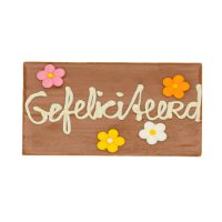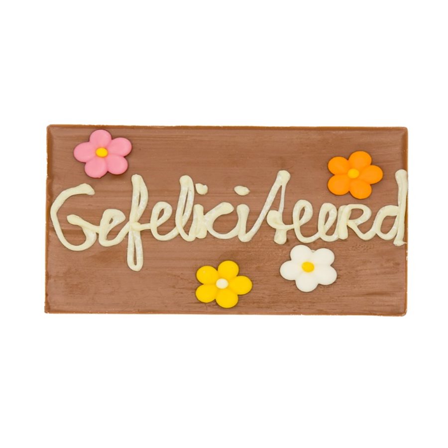De chocolade reep Gefeliciteerd is een handgemaakte chocolade reep om vrolijk van te worden. Deze chocolade reep Gefeliciteerd is gemaakt van heerlijke Belgische melkchocolade! De chocolade reep gefeliciteerd is handgeschreven met witte chocolade, dus elke reep is uniek. Een perfect chocolade geschenk als jij iemand in het zonnetje wil zetten! Met deze chocolade reep Gefeliciteerd kan je alle kanten op!
