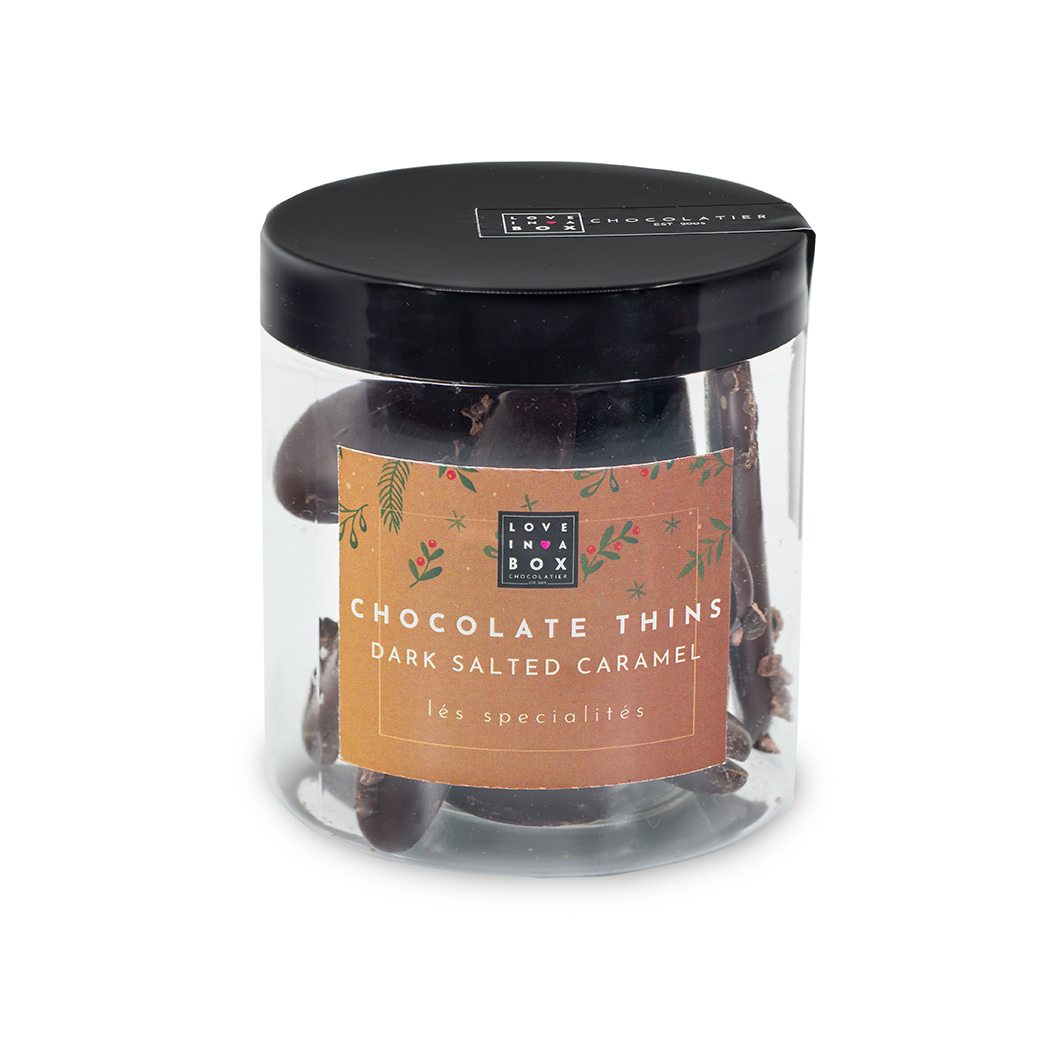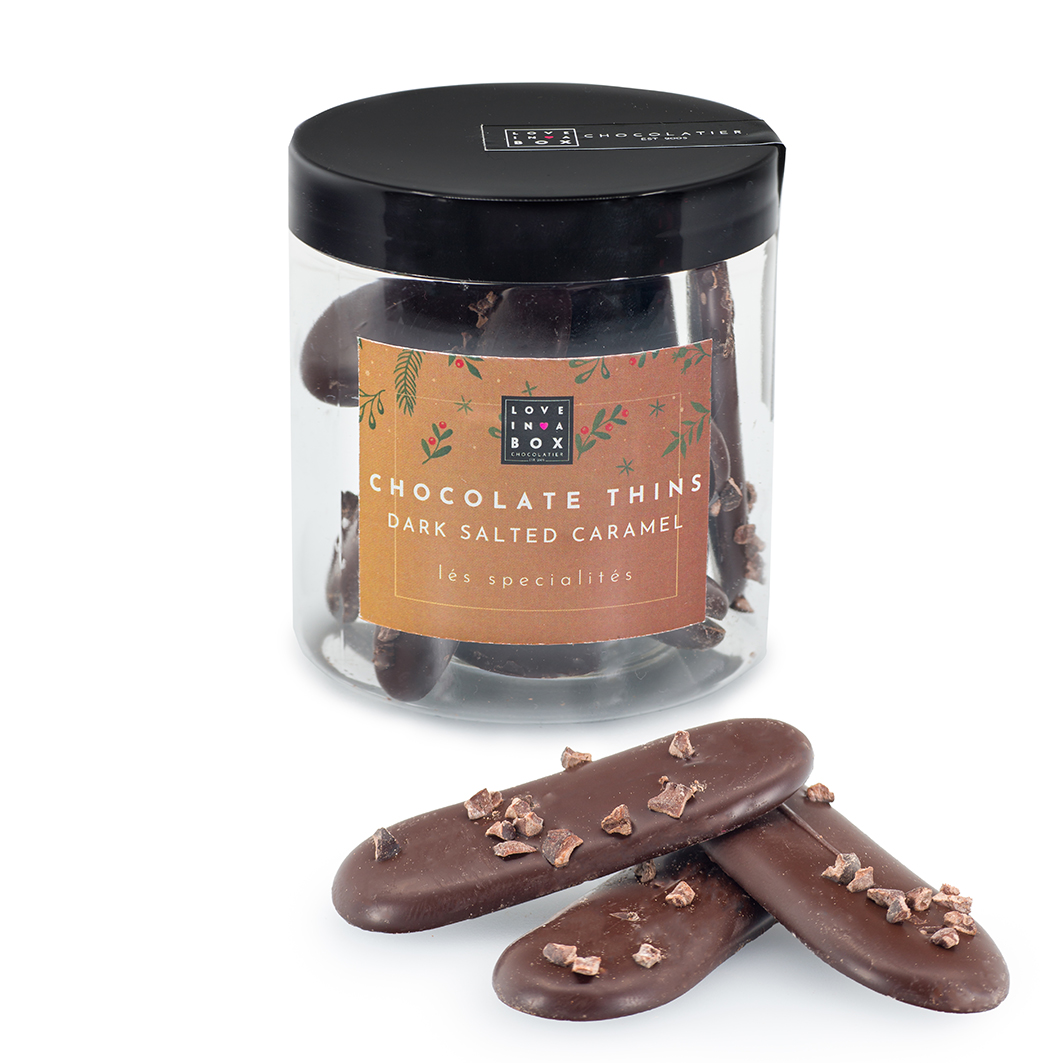 Vier de kerst met de Love in a Box Chocolatde Thins Puur Gezouten Caramel. Heerlijke luxe chocolade thins van pure chocolade gevuld met gezouten caramel. Deze luxe chocolate thins zijn erg leuk op de kersttafel en perfect als kerstcadeau! De Love in a Box Chocolate thins pure chocolade gezouten caramel zijn een absolute traktatie voor de fijnproever. Heerlijke pure chocolade gevuld met een zachte vulling van gezouten caramel.