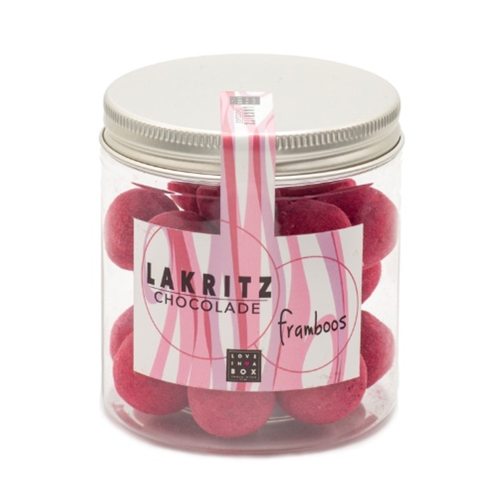 Love in a Box Lakritz Chocolade Framboos is een fruitige chocolade verrassing. Het is een combinatie van heerlijke witte chocolade, gezouten drop en framboos. Chocolade Lakritz Framboos, is een dropje omhult met romige witte chocolade, welke vervolgens in een framboos jasje is gestoken! Laat je verrassen en kies voor de Love in a Box Drop Chocolade Lakritz!