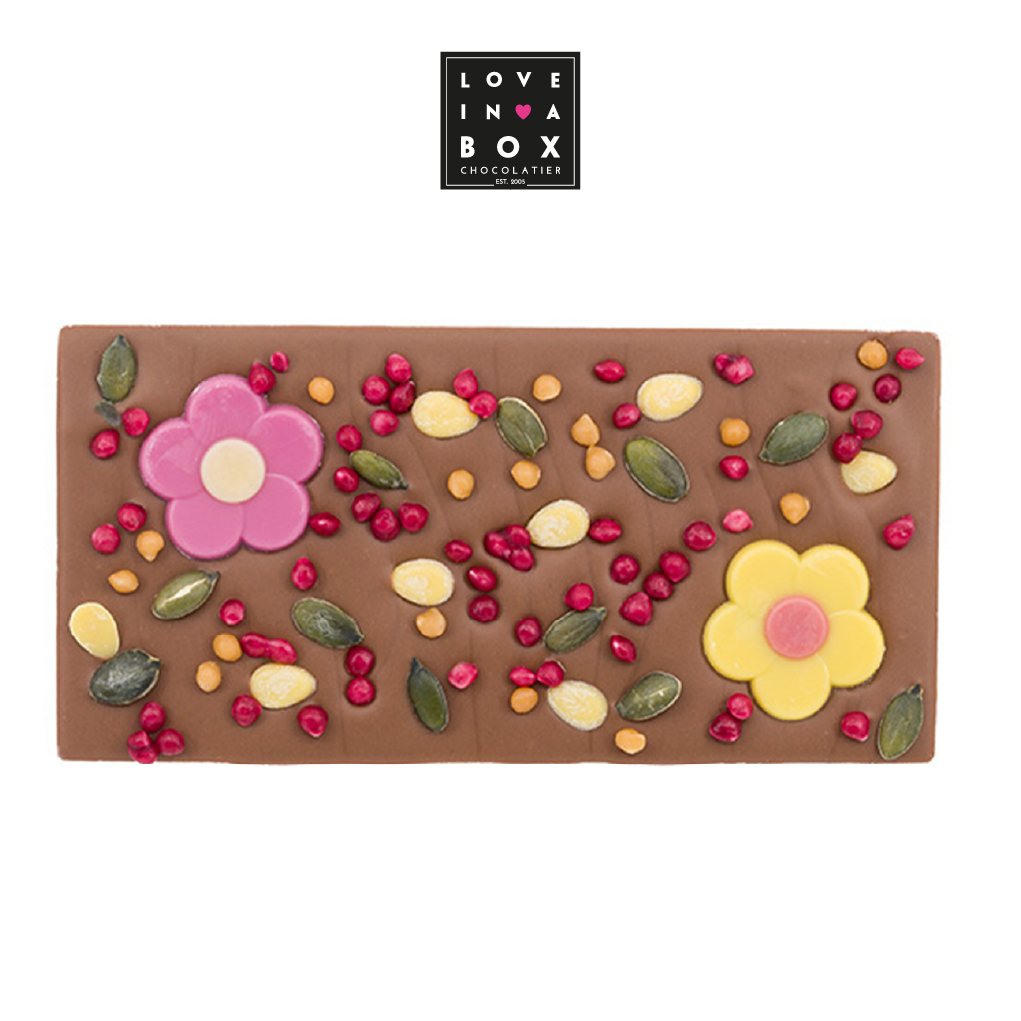 De Love in a Box Chocolade Reep Melk met Happy Easter Decoration is gemaakt van romige melkchocolade met vrolijke paasdecoratie. De Love in a Box melkchocolade reep gedecoreerd met caramelparels, stukjes framboos, pompoenpitten en luxe paasdecoratie is een absolutie traktatie voor de fijnproever. Heerlijke melkchocolade rijkelijk belegd met caramel, pompoenpitten, frambozenparels en vrolijke decoratie. Let wel de samenstelling kan afwijken van de foto.