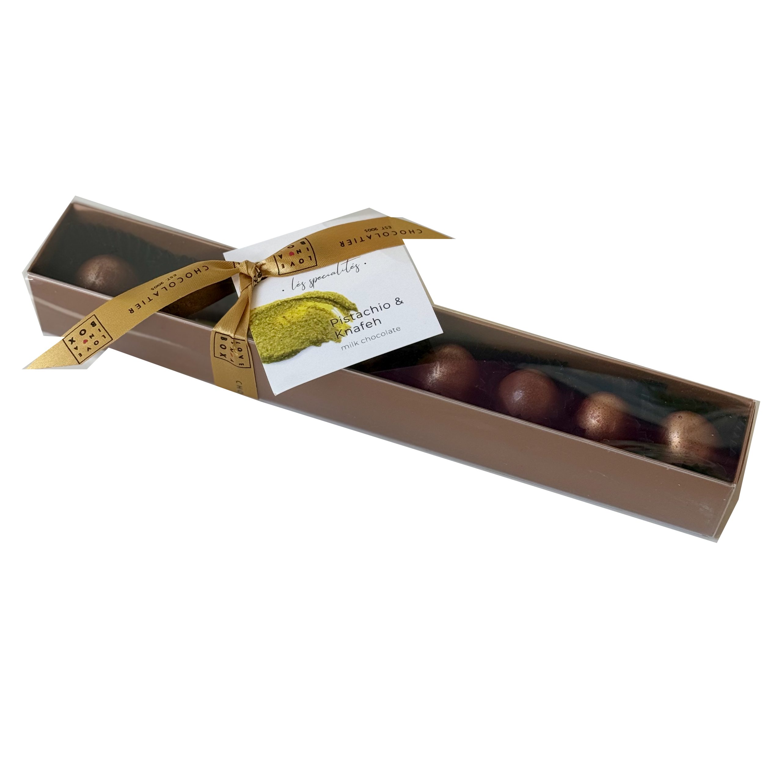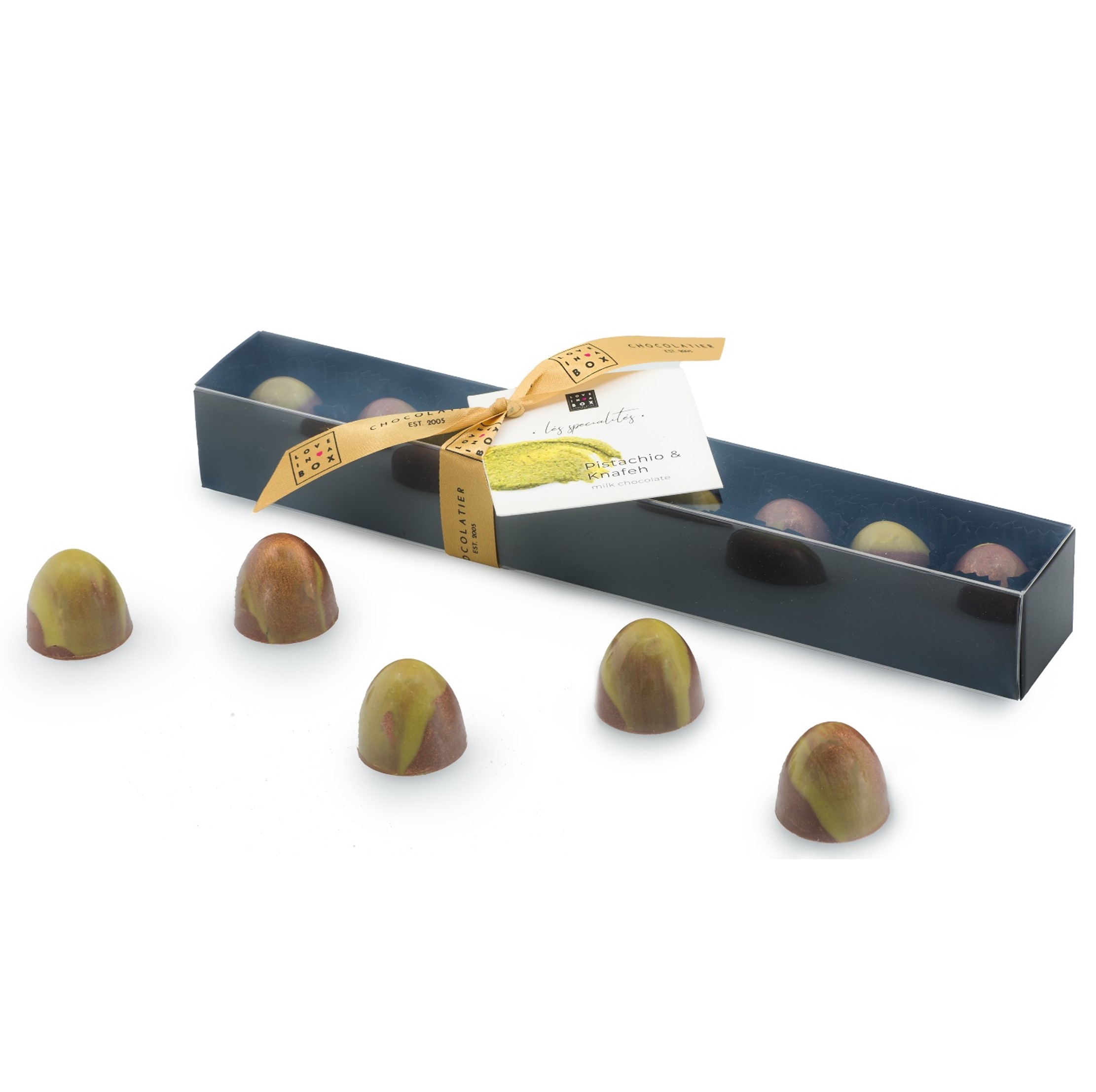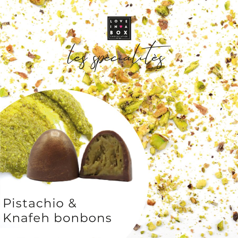 Deze Pistache & Knafeh bonbons, Dubai bonbons hebben verder niet veel meer nodig, wij verpakken deze luxe bonbons in een luxe zwarte geschenkbox (stang) en voorzien dit luxe cadeau met de speciale “Love in a Box” zegel. Want zonder zegel gaat er bij ons geen chocolade de deur uit.