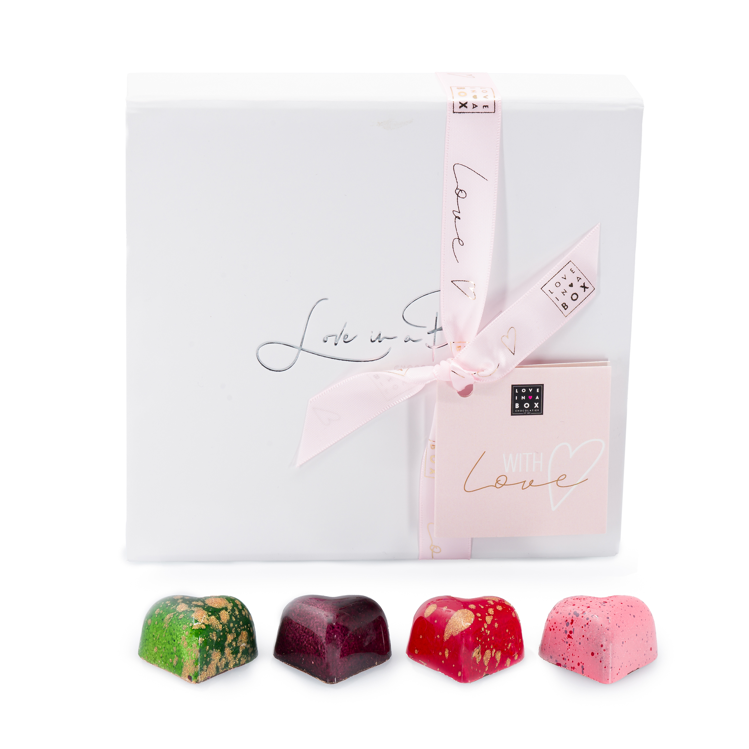 Passie, liefde & chocolade in een Valentijn geschenk. De Signature pralines “With Love Selection” bestaat uit 4 verschillende bonbons. De samenstelling kan per box wijzigen. De 4 hartvormige bonbons hebben een rijke variatie in klassieke en verassende smaken gecombineerd met een sprankelend uiterlijk. Absolute kunstwerken van onze chocolatiers. Smaken binnen deze luxe selectie zijn: cassis, limoen & ananas, mascarpone framboos en yoghurt mango. Kortom een heerlijke selectie waar vrijwel elke liefde een eigen favoriet zal ontdekken. De luxe chocolade uit de Love in a Box Valentijn collectie zijn verfijnde chocolade cadeaus voor de liefhebbers! De chocolade is perfect als geschenk, als traktatie, maar ook heerlijk als tussendoortje!